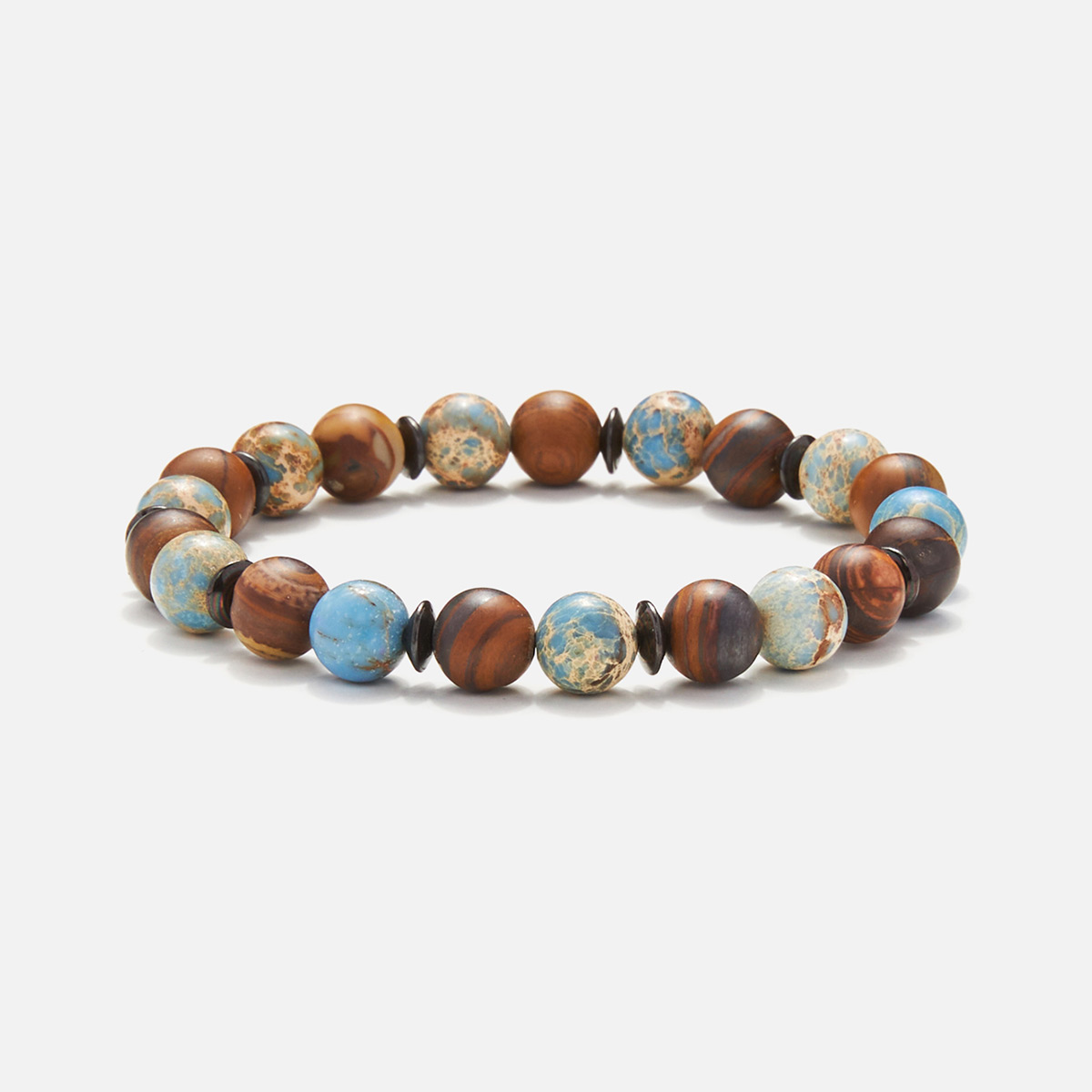 Ανδρικό χειροποίητο βραχιόλι με φυσικές ορυκτές πέτρες από πολύχρωμο ματ αχάτη (0.8mm) και ροδέλα αιματίτη (0.6mm). Ελαστικό με κατασκευή από σιλικόνη (1.0mm).