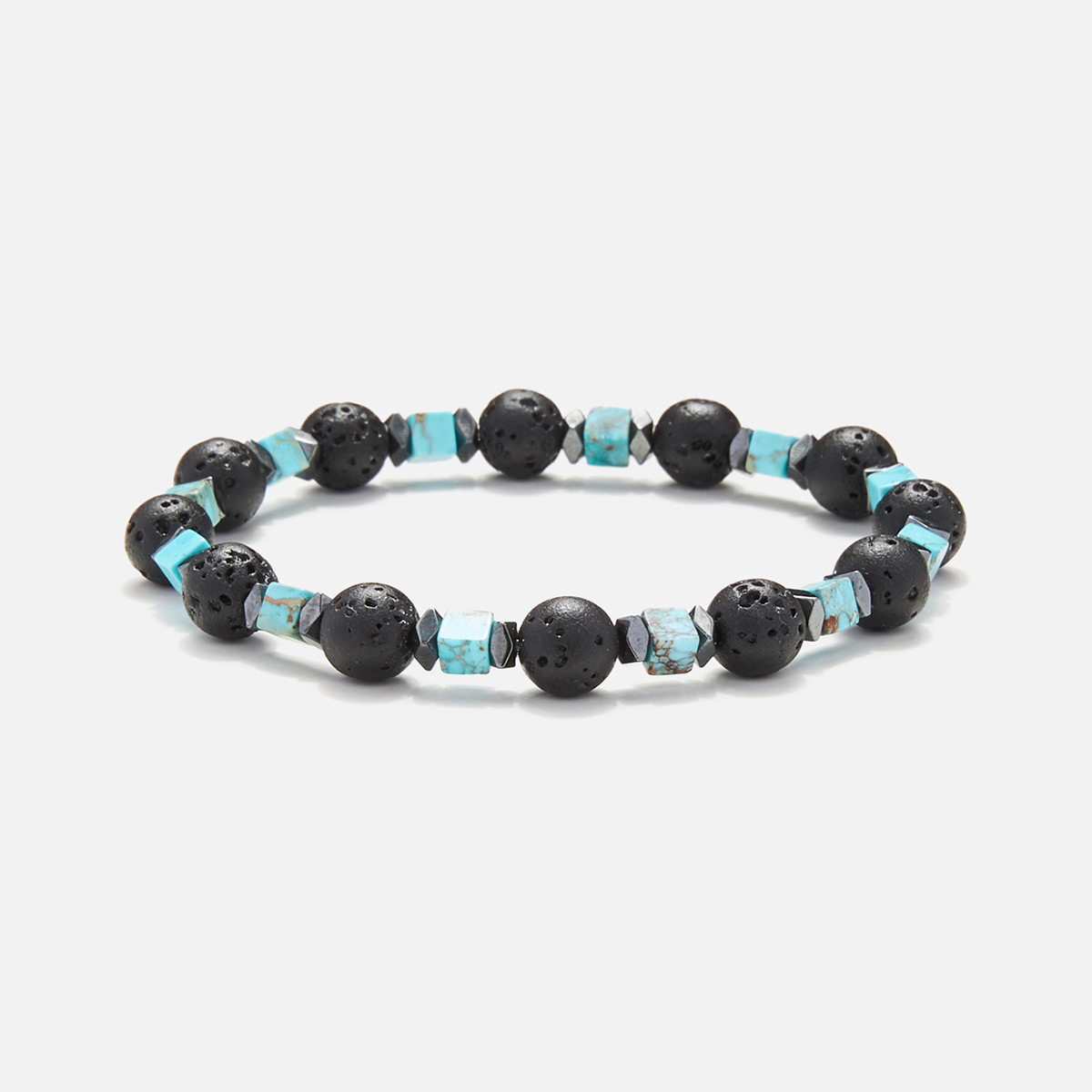 Ανδρικό χειροποίητο βραχιόλι με φυσικές ορυκτές πέτρες από μαύρη λάβα (0.8mm), τετράγωνο τιρκουάζ χαολίτη (0.4mm) και ασύμμετρο αιματίτη (0.4mm). Ελαστικό με κατασκευή από σιλικόνη (1.0mm).