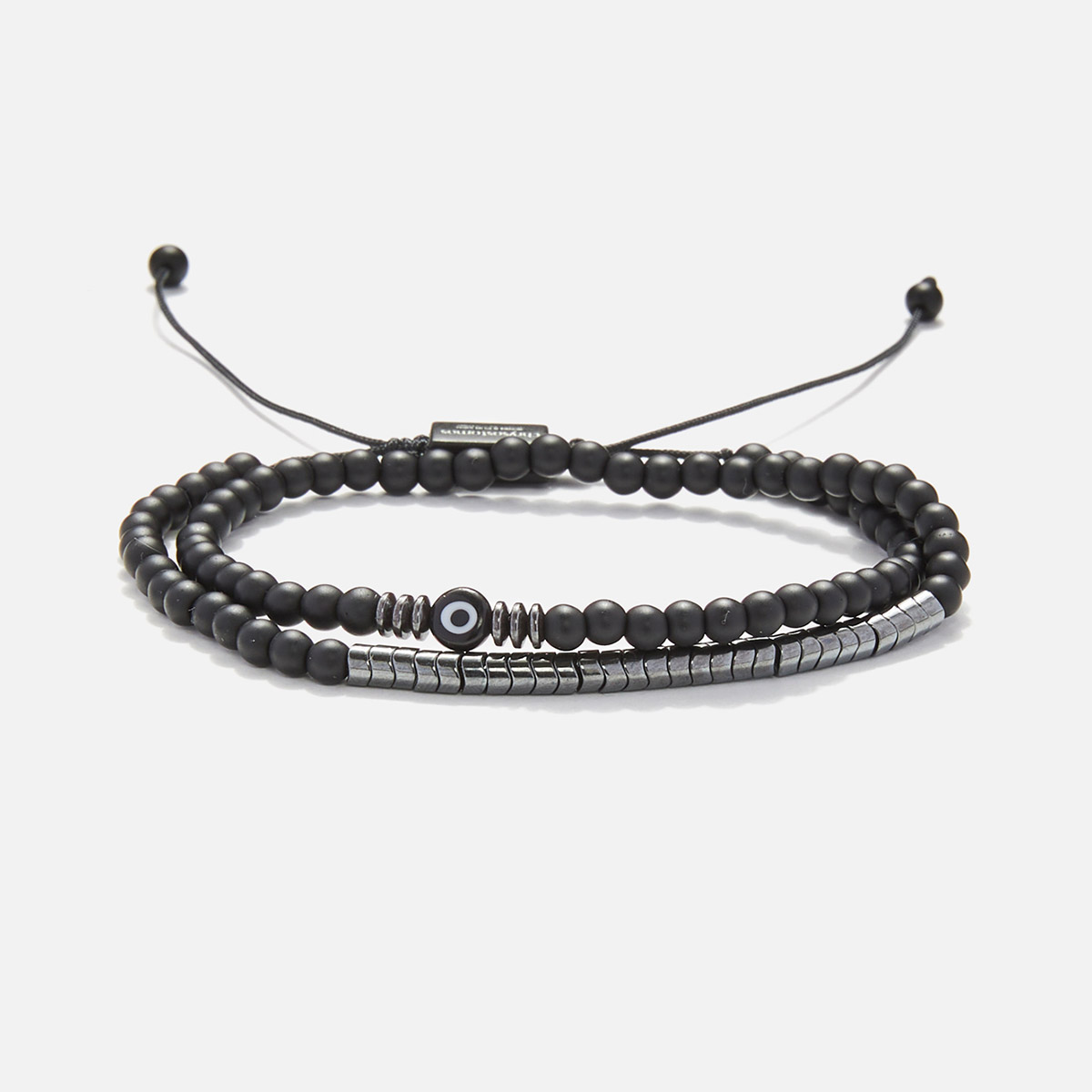Ανδρικό χειροποίητο διπλό βραχιόλι με φυσικές ορυκτές πέτρες από μαύρο όνυχα (0.4mm), ροδέλα – κύμα αιματίτη (0.4mm) και μαύρο γυάλινο ματάκι. Κατασκευή με κορδόνι και δέσιμο μακραμέ.
