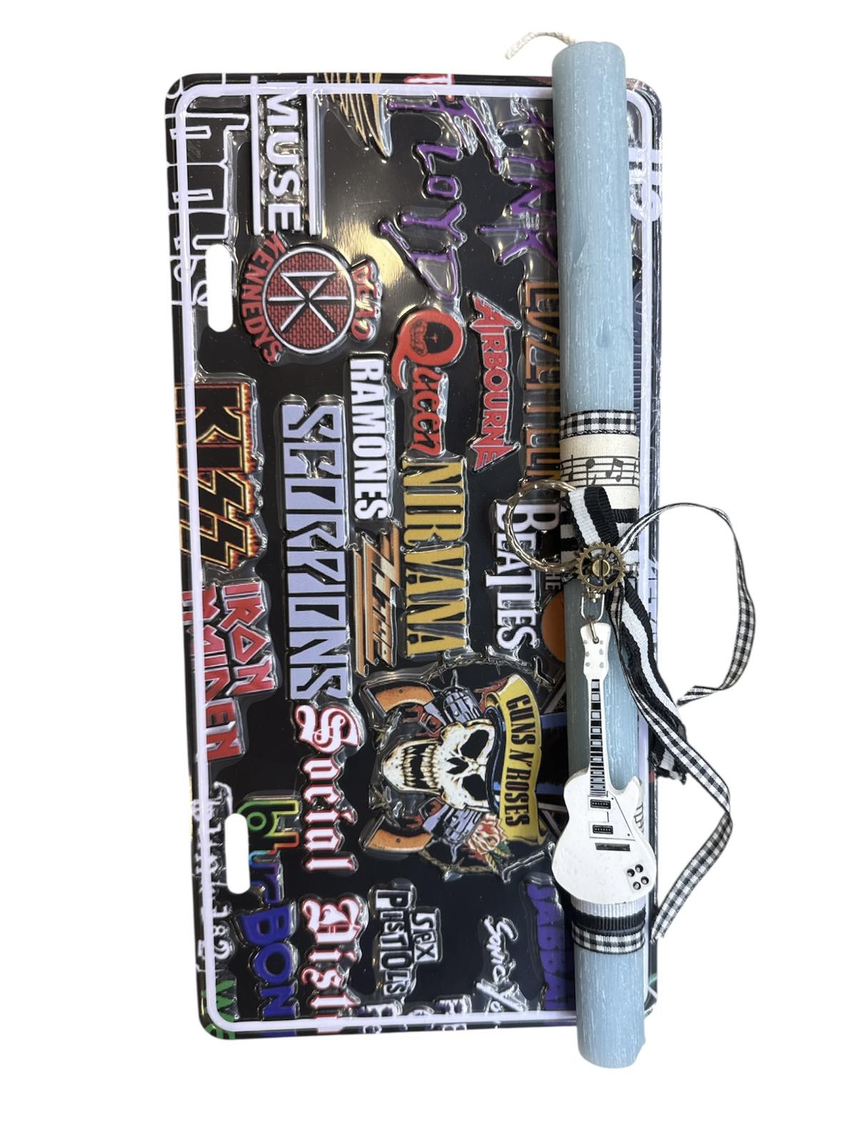 Πασχαλινή χειροποίητη λαμπάδα κιθάρα μπρελόκ και μεταλλική πινακίδα με συγκροτήματα